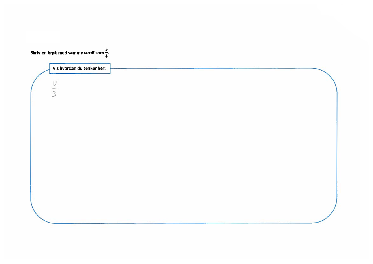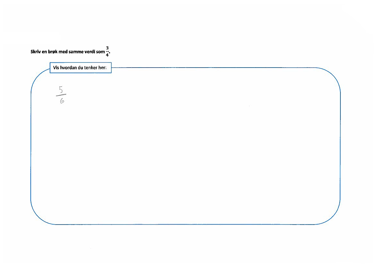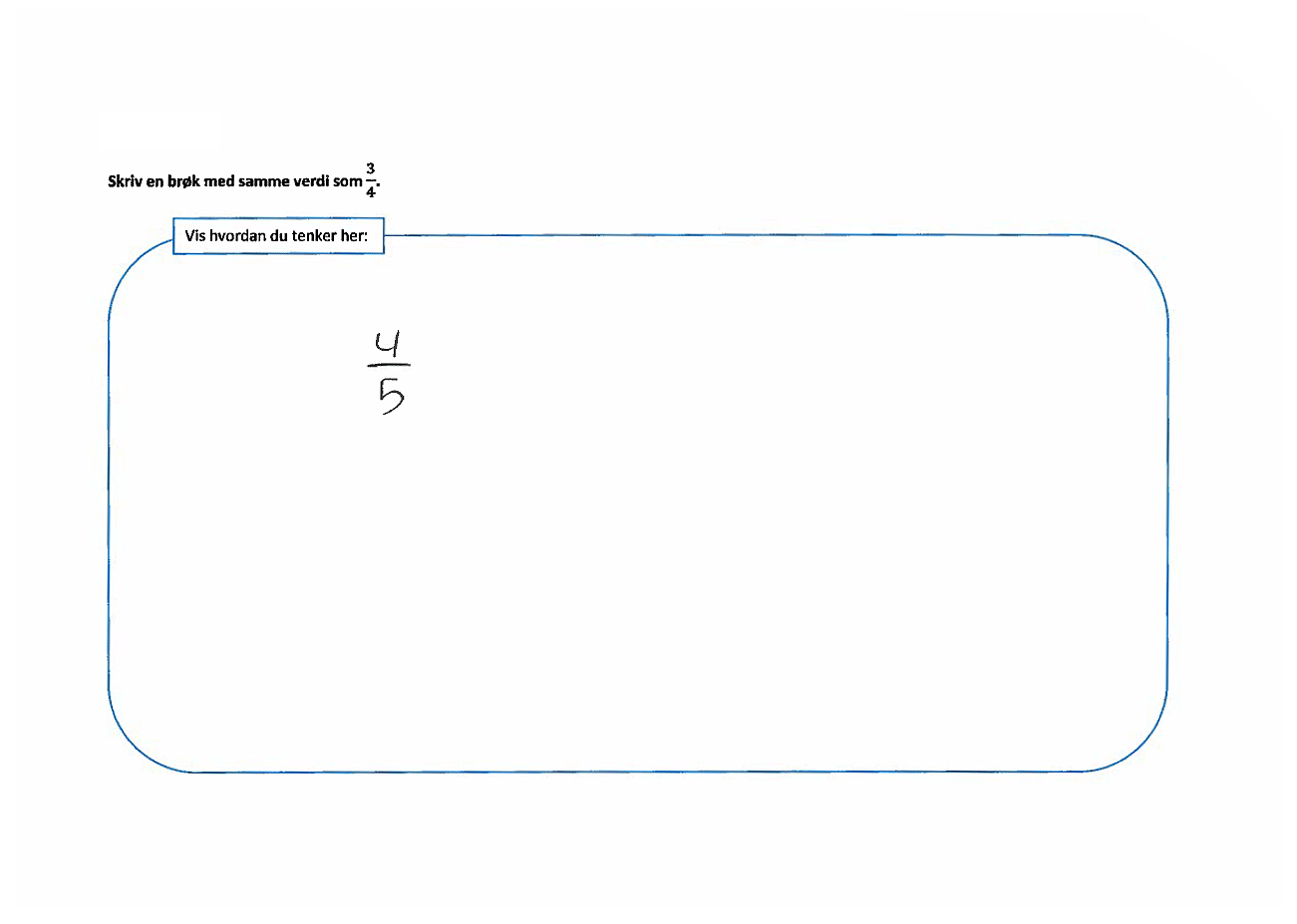 I oppgave 13 i prøven for 5.–7. trinn og oppgave 21 for 8.–10. trinn skal elevene velge en brøk som er likeverdig med `(3)/(4)`. Av elevene som svarer 5 i oppgave 11, svarer 63 % at `(4)/(5)` har samme verdi som `(3)/(4)`. Det gjelder både for elever på 6. og 9. trinn.