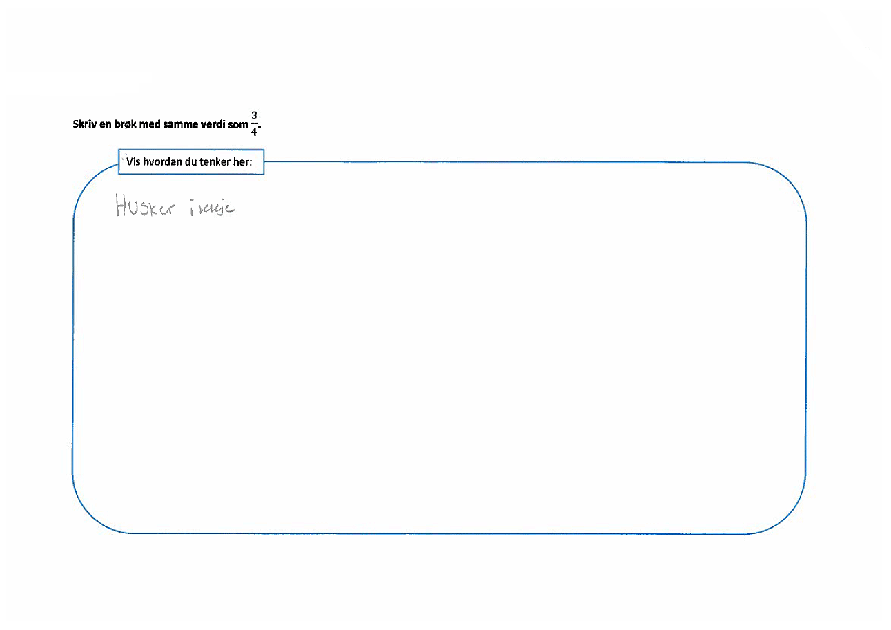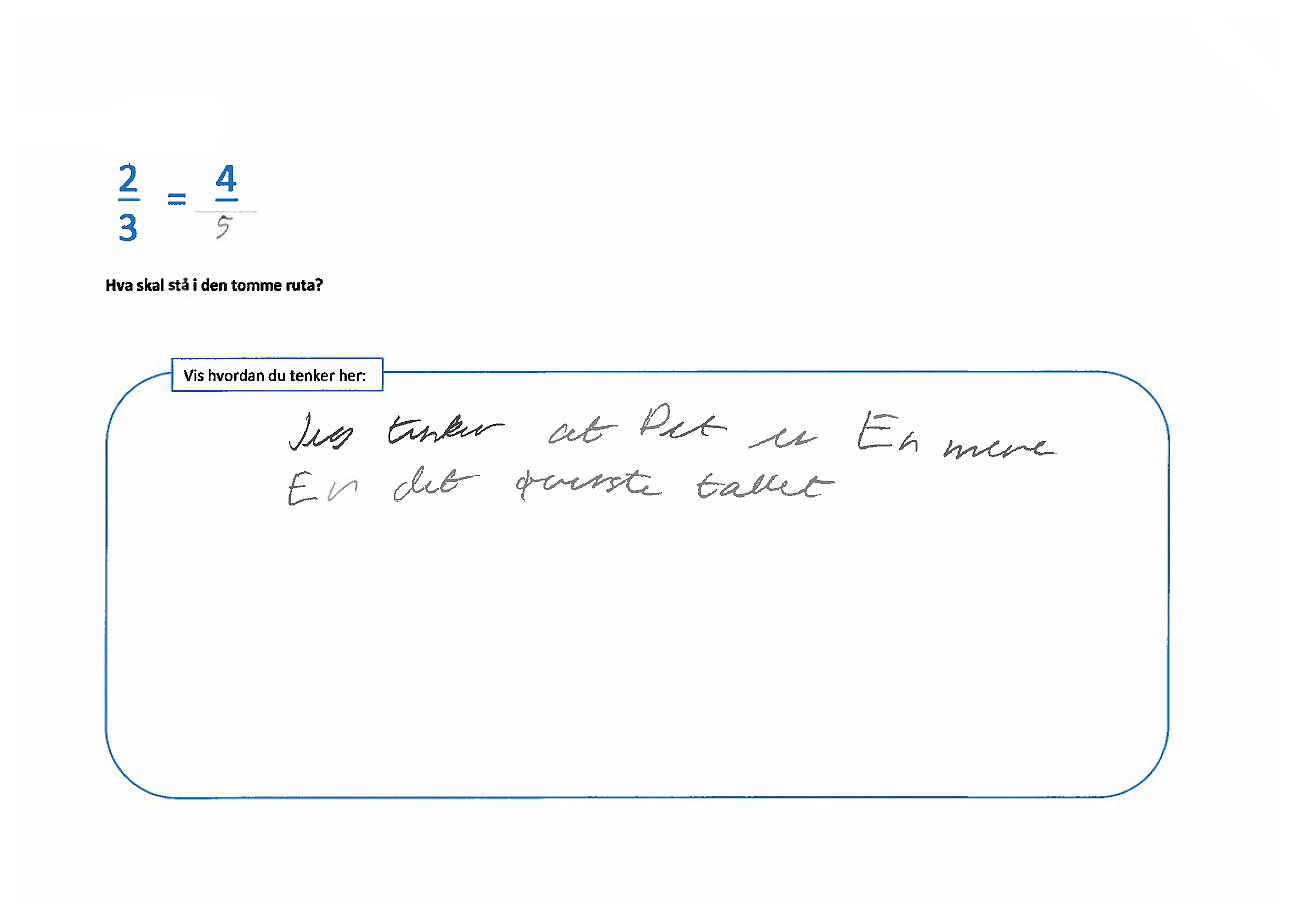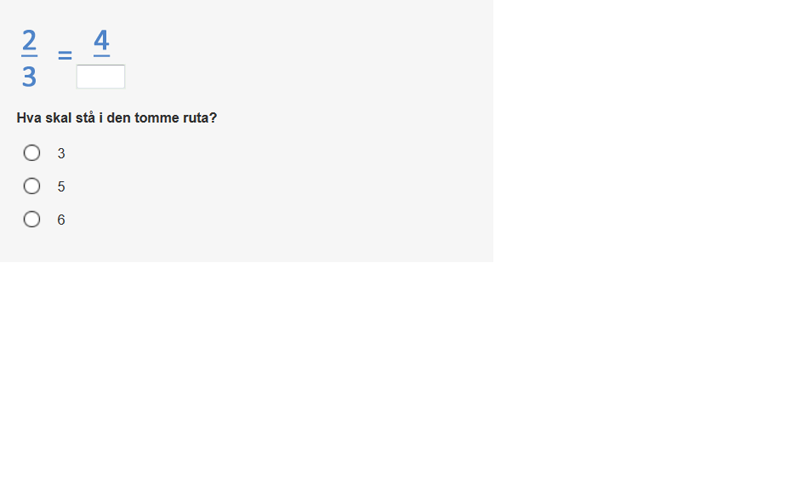 I oppgave 13 i prøven for 5.–7. trinn og oppgave 21 for 8.–10. trinn skal elevene velge en brøk som er likeverdig med `(3)/(4)`. Av elevene som svarer 5 i oppgave 11, svarer 63 % at `(4)/(5)` har samme verdi som `(3)/(4)`. Det gjelder både for elever på 6. og 9. trinn.
