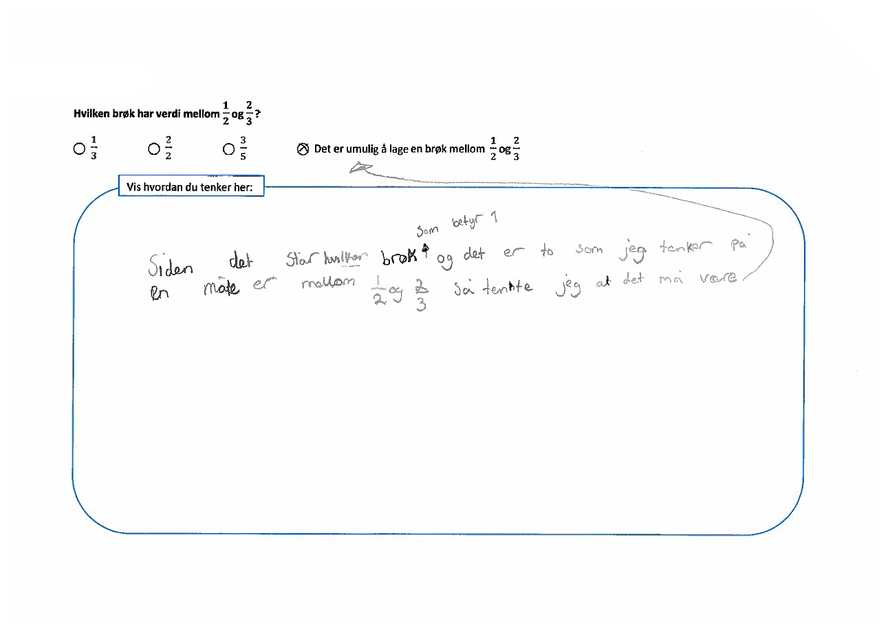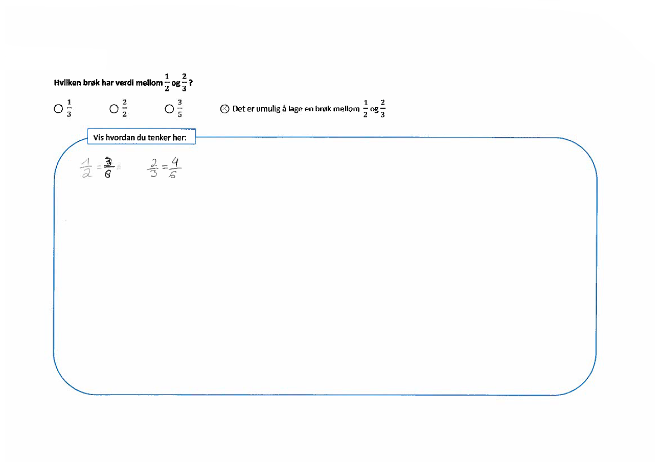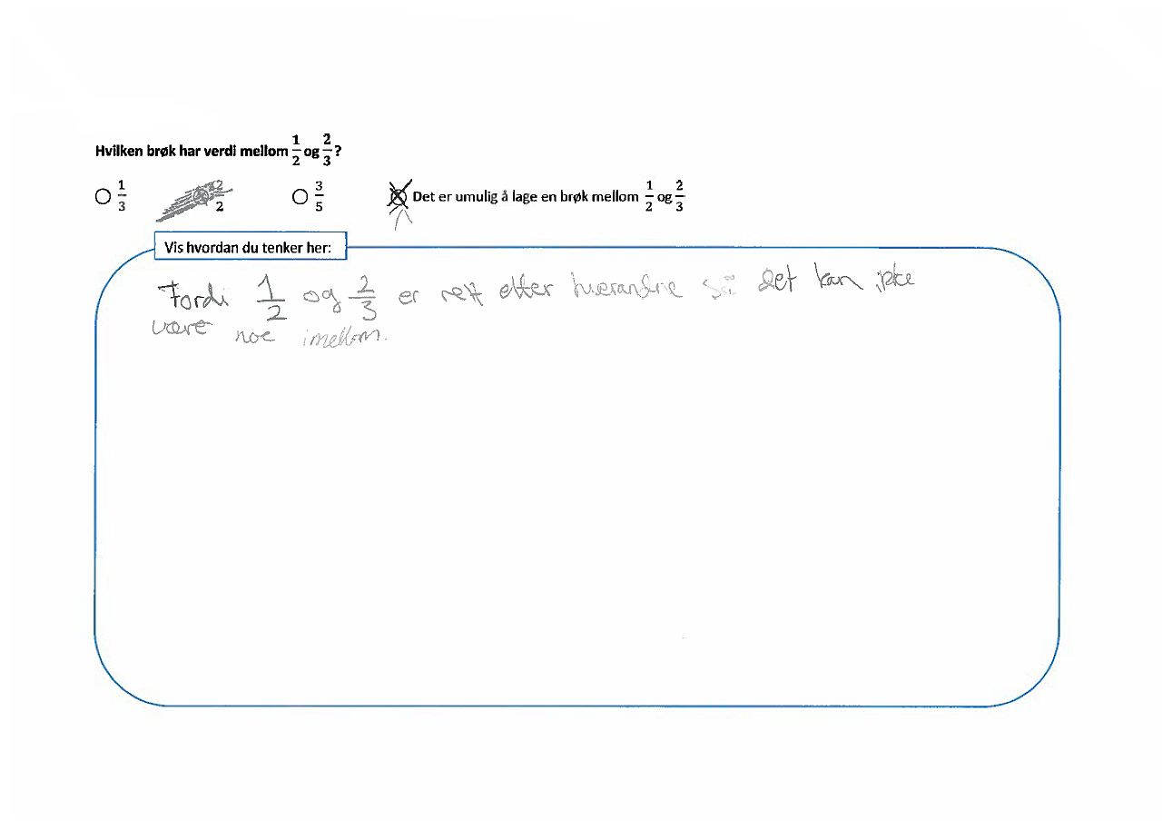 I oppgave 8 skal elevene velge en brøk som har verdi mellom `(1)/(2)` og `(2)/(3)`, to brøker der differansen mellom teller og nevner er lik i begge. 22 % av elevene på 6. trinn og 37 % av elevene på 9. trinn løser denne oppgaven riktig, og det mest høyfrekvente feilsvaret på begge trinn er: «Det er umulig å lage en brøk med verdi mellom `(1)/(2)` og `(2)/(3)`»
