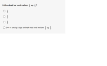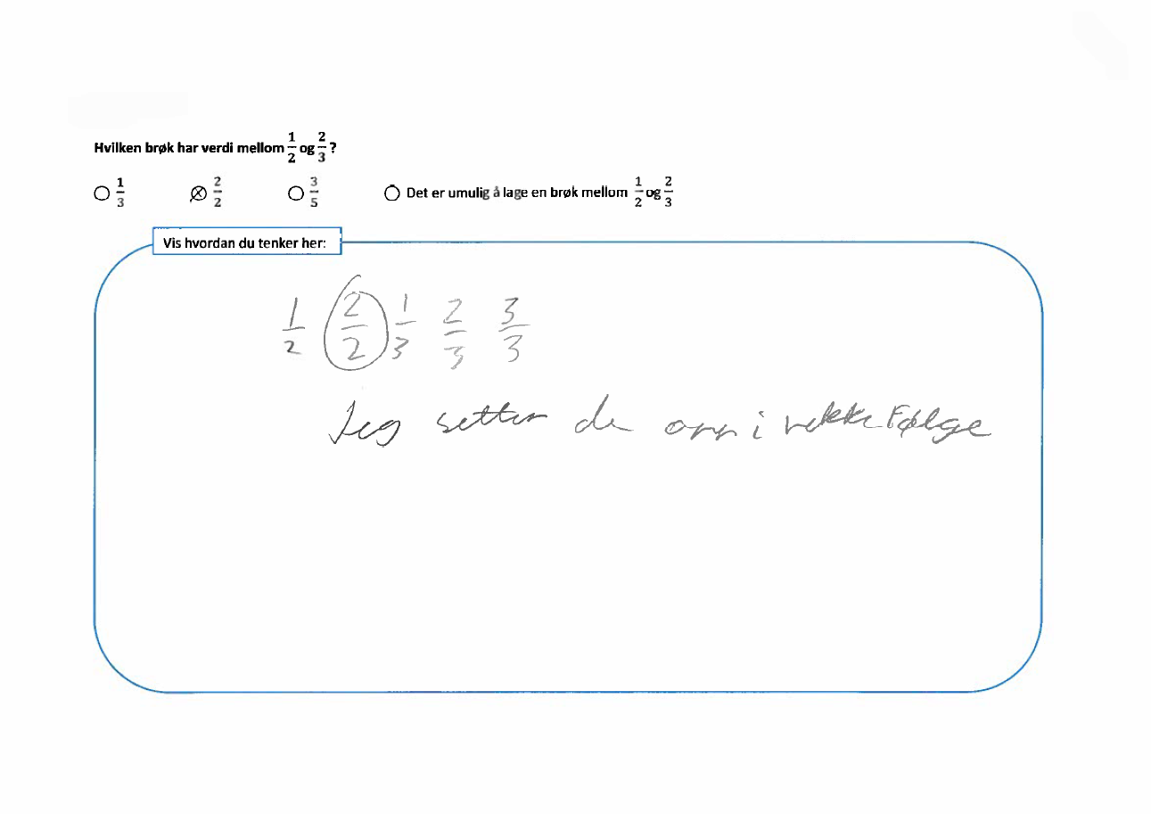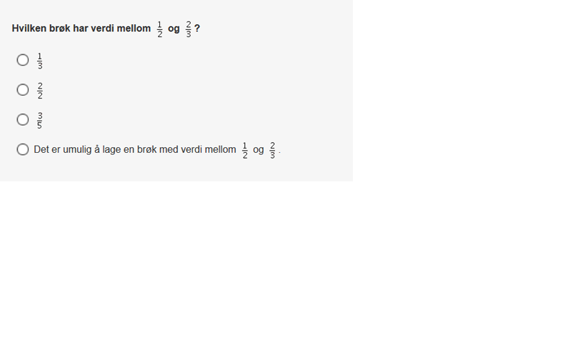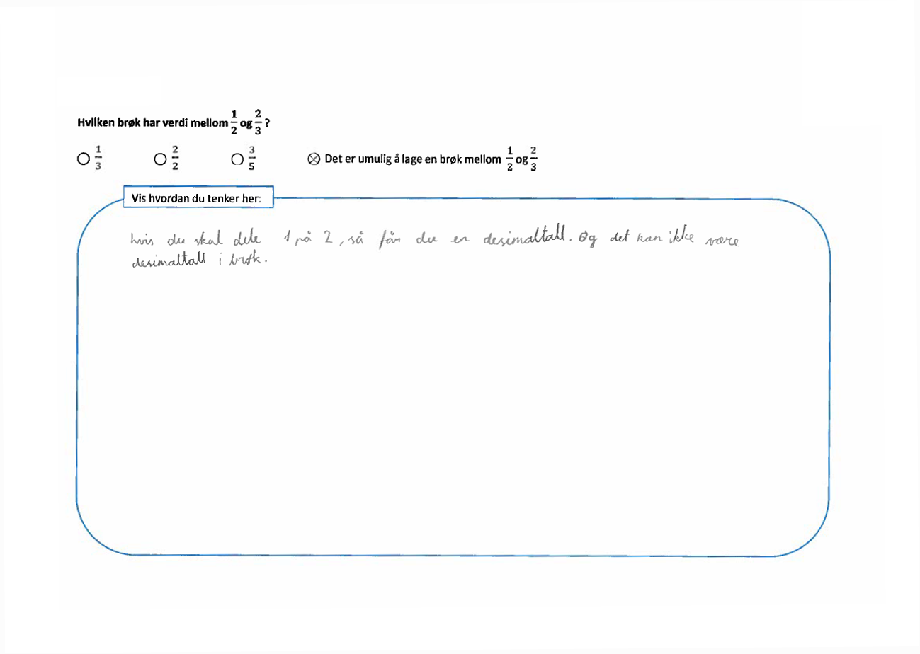 I oppgave 8 skal elevene velge en brøk som har verdi mellom `(1)/(2)` og `(2)/(3)`, to brøker der differansen mellom teller og nevner er lik i begge. 22 % av elevene på 6. trinn og 37 % av elevene på 9. trinn løser denne oppgaven riktig, og det mest høyfrekvente feilsvaret på begge trinn er: «Det er umulig å lage en brøk med verdi mellom `(1)/(2)` og `(2)/(3)`»