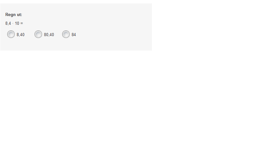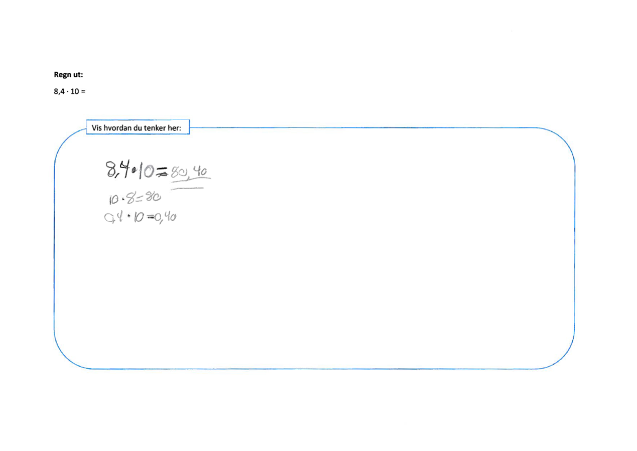 I oppgave 10 skal elevene multiplisere 8,4 med 10. De som tenker på multiplikasjon med 10 som å legge til én null, vil svare enten 8,40 eller 80,40. De som svarer 8,40, legger til en null bakerst i tallet, mens de som svarer 80,40, legger en null til både 8 og 4. Elever som svarer 80,40 ser trolig på desimaltall som par av hele tall, som er en misoppfatning som blir grundig testet i prøven Tall.
