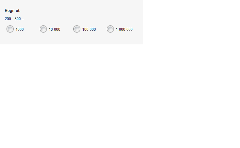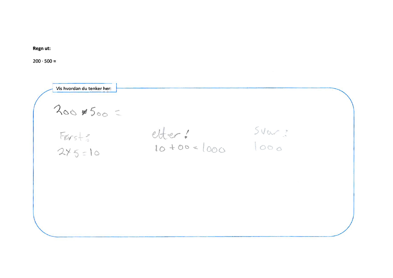I prøven misoppfatninger knyttet til tallregning er det fire oppgaver som tester misoppfatningen fjerne og legge til nuller. Disse oppgavene er med i prøven for både 5.–7. trinn og 8.–10. trinn. Nedenfor ser du tre av dem.
