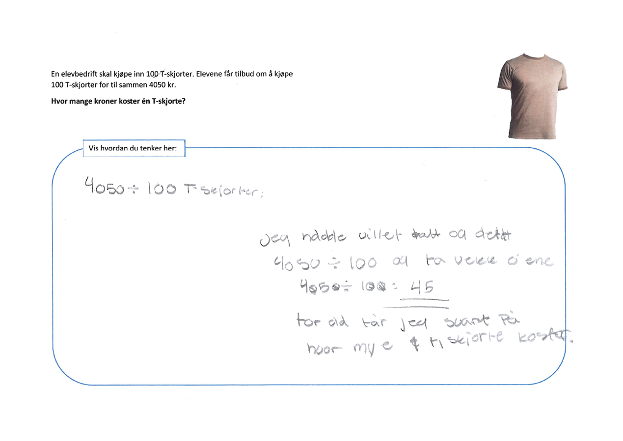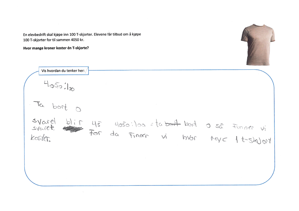 Tabellen viser at 32 % av elevene på 6. trinn og 17 % av elevene på 9. trinn svarer 45 når de skal dividere 4050 med 100. Feilsvaret tyder på at de ser på det å dividere med 100 som å fjerne to nuller, og fjerner de to nullene i 4050, uavhengig av hvilken plass nullene står på. De andre feilsvarene i oppgaven stemmer med at elevene fjerner én av nullene.