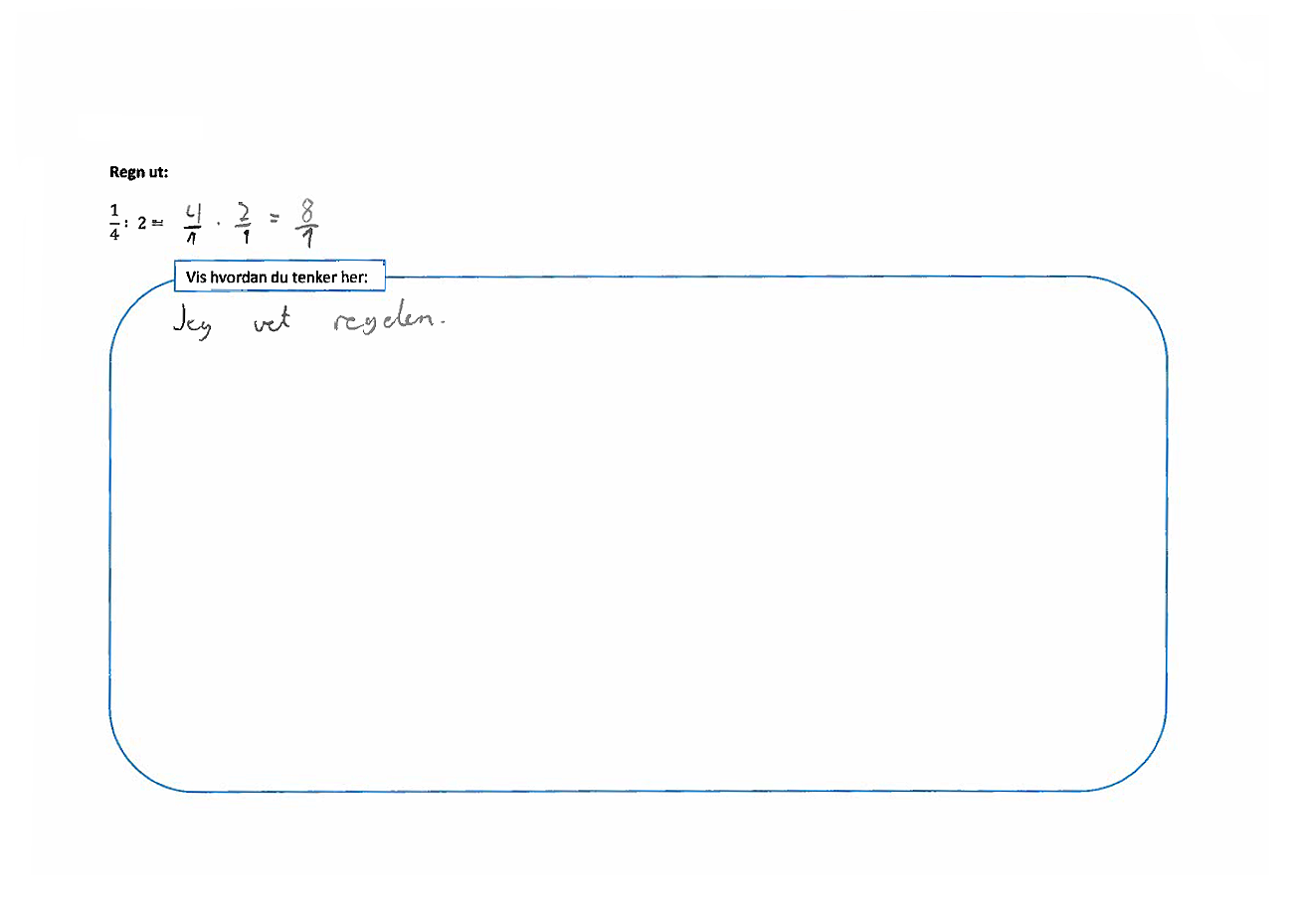 Multiplikasjon og divisjon av brøk, rent mekanisk, er enkelt. I multiplikasjon er huskeregelen multiplisere teller med teller og nevner med nevner, og i divisjon snu den bakerste brøken og multiplisere. Når reglene er så enkle, er det mer fristende å bare pugge dem enn å prøve å forstå hvorfor de virker. Bruk av reglene alene gir ikke elevene innsikt i om løsningen de får, er rimelig. For å kunne løse oppgavene må de stole på hukommelsen. Det kan ofte føre til feil svar. Elevene kan for eksempel blande reglene for addisjon og multiplikasjon. De bruker «multiplikasjonsregelen» i addisjon og glemmer hvilken brøk de skal snu i divisjon. Figur 6 viser eksempler på elever som er usikre på reglene. De adderer teller med teller og nevner med nevner, og snur den første brøken i divisjon.