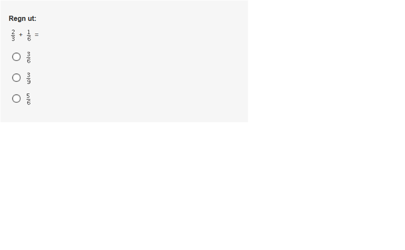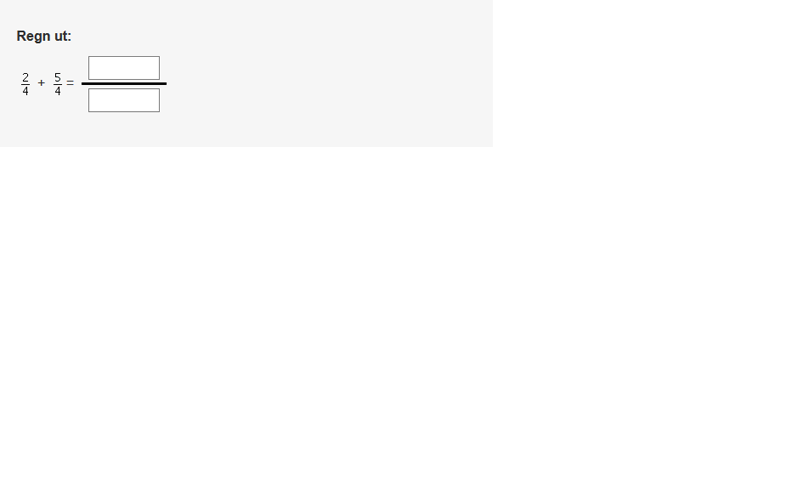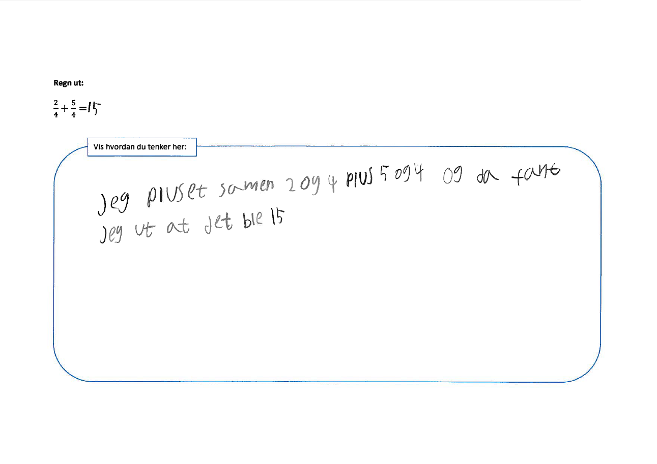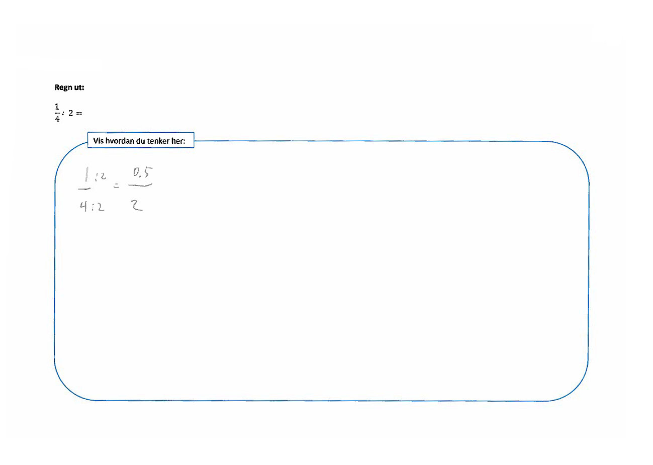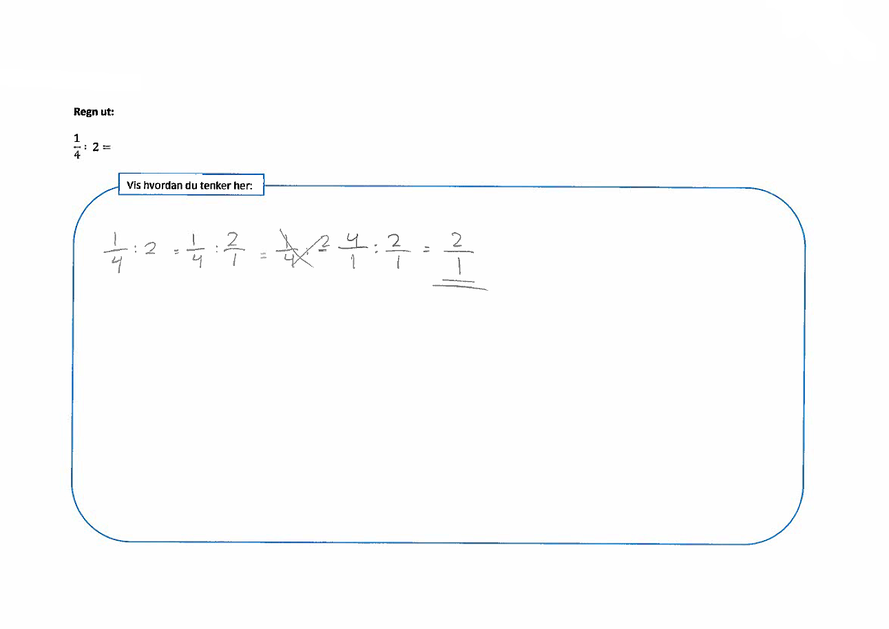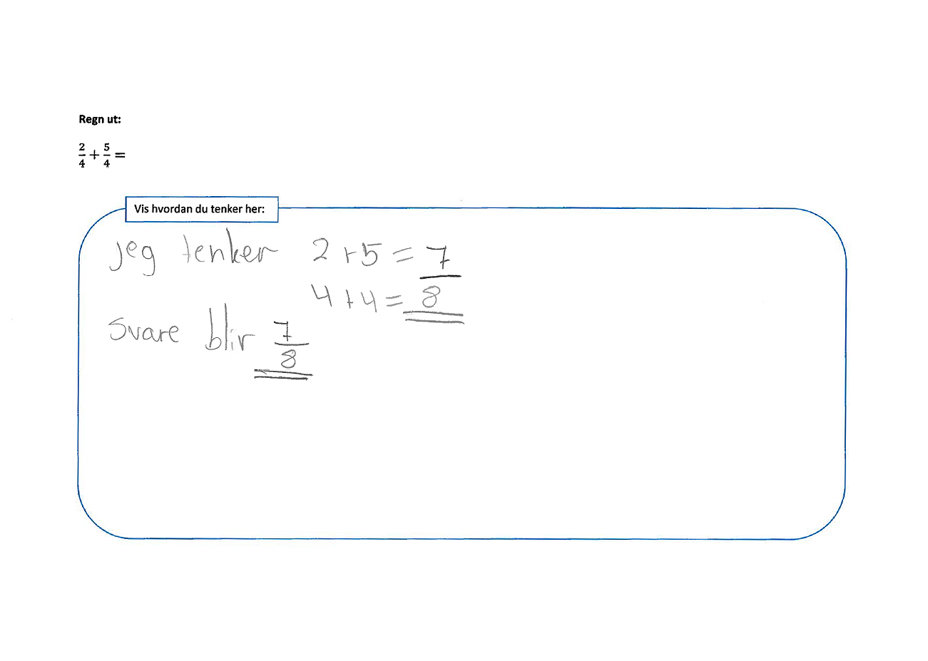 I oppgave 5 i prøven for 5.–7. trinn og oppgave 16 i prøven for 8.–10. trinn skal elevene regne med brøk. I oppgave 5 skal de addere to brøker med samme nevner, `(2)/(4)` og `(5)/(4)`. Resultatet av analysene tyder også her på at mange elever er i heltallstenking, i og med at 44 % av elevene på 6. trinn adderer teller med teller og nevner med nevner og svarer `(7)/(8)`. I oppgave 16 skal elevene regne ut `(1)/(4) : 2`, altså halvparten av `(1)/(4)`. Elevsvarene nedenfor tyder på at mange prøver å huske en regel for divisjon med brøk, men at de enten husker feil, eller at de møter problemer fordi det er brøk og heltall og ikke brøk og brøk i oppgaven. Elevsvarene `(8)/(1)` og `(8)/(2)` er tydelige eksempler på det. I tillegg viser det at elevene enten har veldig lav brøkforståelse eller i alle fall reflekterer svært lite over svaret sitt.