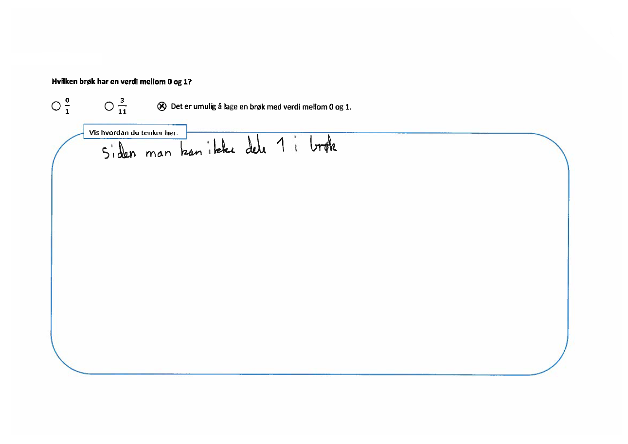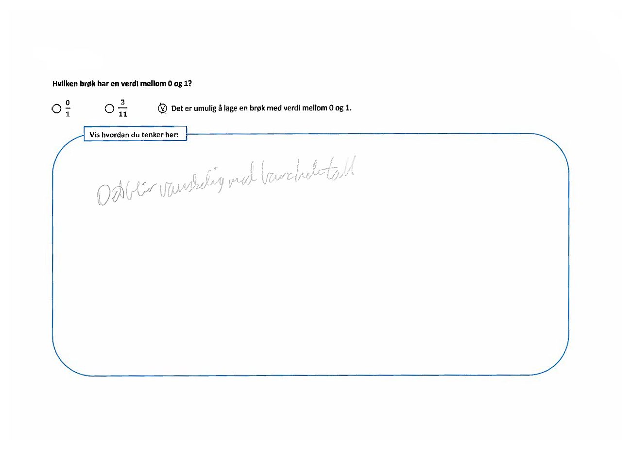 Oppgave 20 utfordrer elevene som er i heltallstenking, ved at de skal velge en brøk som har verdi mellom 0 og 1. Som elevsvarene nedenfor viser, får disse elevene problemer, siden de ikke finner noe heltall mellom 0 og 1. Det vil derfor oppleves som umulig å lage en brøk med verdi mellom 0 og 1. Resultatet av analysene viser at dette gjelder 40 % av elevene, både på 6. og 9. trinn.