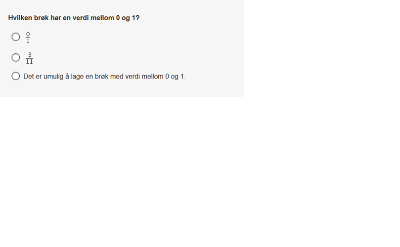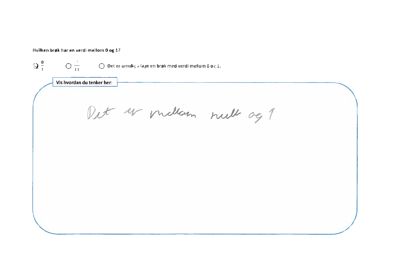 Elever som svarer `(0)/(1)` tenker trolig ikke over at en brøk har en verdi, men tar bare tallene fra oppgaven og skiller dem med en brøkstrek.