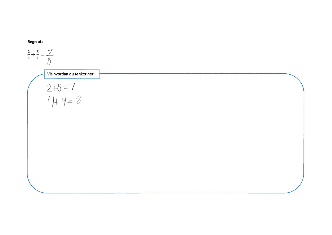 Ved å reflektere rundt brøker som størrelser vil elevene erfare at denne tenkningen ikke fører fram til riktig svar. I dette eksemplet er begge brøkene en halv eller mer, så elever som har forstått brøk, vil se at summen må bli mer enn en hel.