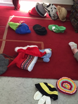 Ta fram en kurv eller veske med ulike typer hatter og luer. La barna få beskrive hattene. Her er rike muligheter til å snakke om de ulike formene hattene har, sammenligne dem og sortere dem i grupper.
