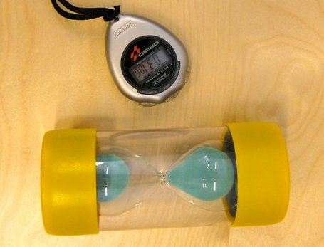 Sjekk ved å snu timeglasset, telle opp fra 0 - 60 og neste runde fra 60 og ned til 0. Det er om å gjøre å klare det akkurat likt med at sanden renner ut.