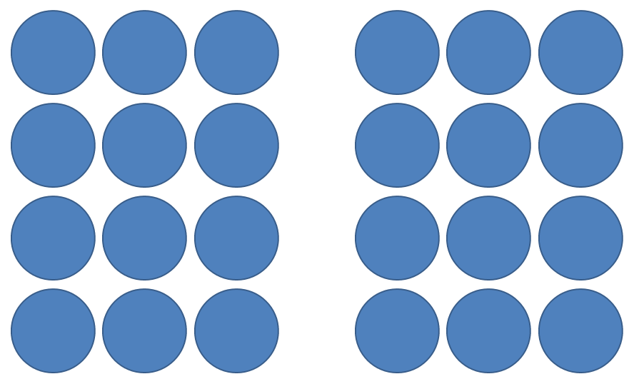 En måte å tenke antall prikker på er å se at bildet består av to deler. I hver av delene er det tre kolonner med fire prikker i hver, altså 3 · 4 prikker. Antall prikker totalt kan da uttrykkes symbolsk som (3 · 4) · 2.