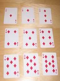 Plukk ut kortene fra 1 (ess) til 9 i en farge; hjerter, ruter, spar eller kløver. Legg kortene i tre rader og tre kolonner. Se bildet over.