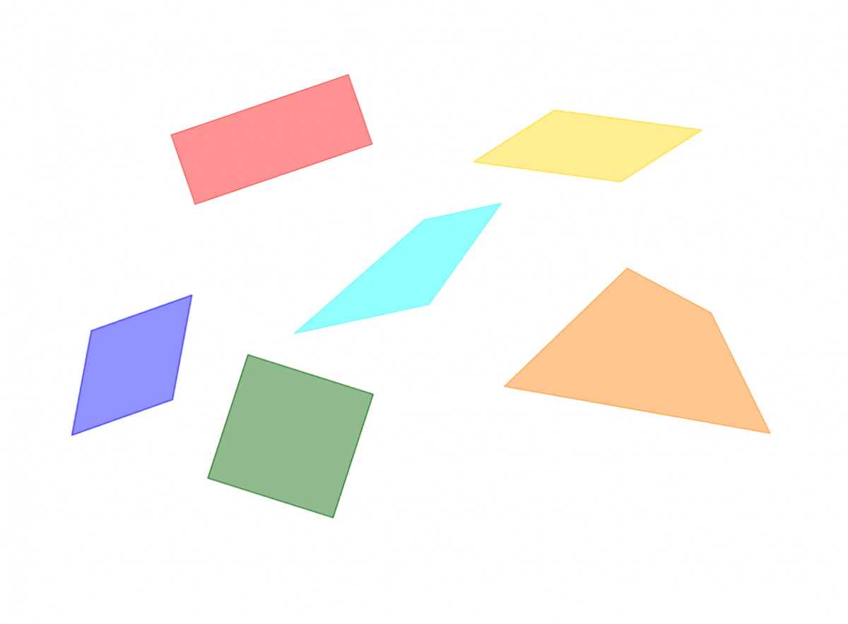 - I samtalen etterpå kan læreren oppfordre elevene til å se om alle egenskapene er nødvendig for å beskrive en av firkantene ovenfor. Er det noen egenskaper som er felles for flere firkanter?