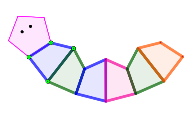 I oppgave 3 skal elevene lage en larve ved å speile firkanter. Like viktig som et pent sluttresultat, er at elevene leker med oppgaven. De må få anledning til å oppdage fordelen ved å arbeide i GeoGebra. Hvorfor beveger hele larven seg hvis elevene drar i ett punkt? Hva må de gjøre for at larven skal bli liten eller kanskje veldig stor?