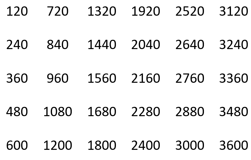 Siden tabellen er en multiplikasjonstabell for 120, finner vi for eksempel 13 · 120 = 1560 i tredje rute i tredje kolonne. I de to første kolonnene har vi multiplisert 120 med tallene 1-10.