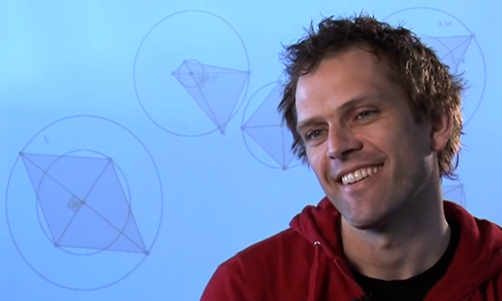 Bilde av en mann i rød genser, sitter foran en blå bakgrunn med matematiske figurer.