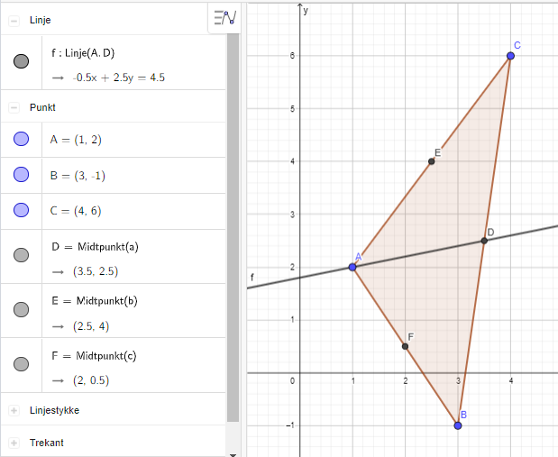 På elevarket er det laget en tegning av trekanten som elevene kan bruke som skisse. Ved å bruke den blir det enklere til å ha kontroll over alle punkter og linjer. Elevene får lov til å bruke den innebygde kommandoen Skjæring for å finne tyngdepunktet. Elever som trenger ekstra utfordringer, kan å finne skjæringspunktet med CAS.