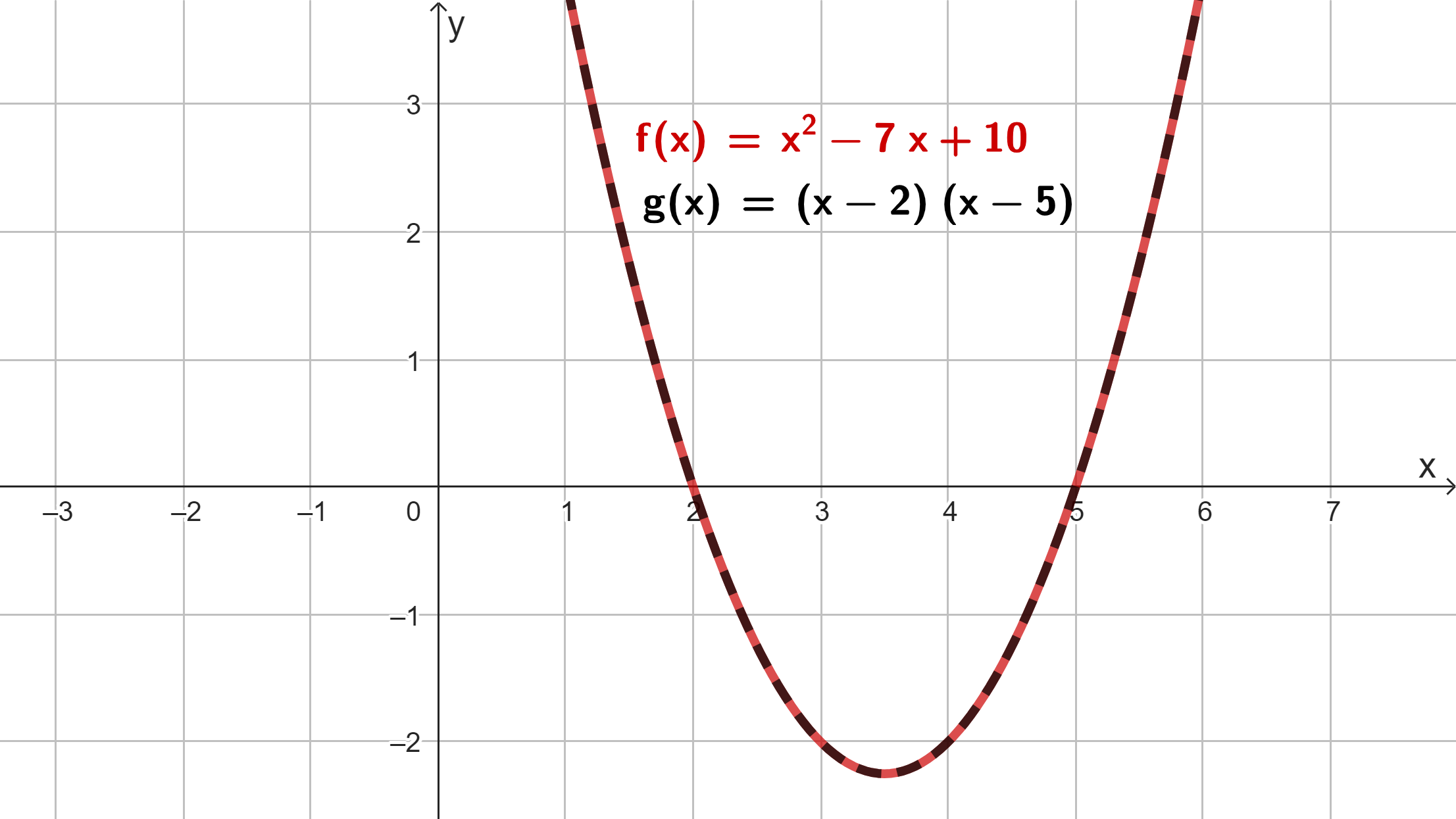 Bilde av to grafer, f(x) = x2 - 7x + 10 og g(x) = (x – 2)(x - 5).