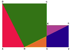 Vi har to kvadrater slik som vist på figuren nedenfor. Sidelengden til det lille kvadratet BFGE er halvparten av sidelengden i det store kvadratet ABCD. Punktet H ligger midt på sida AB.
