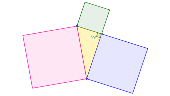 Elevene starter med å lage en dynamisk, rettvinklet trekant. Det kan de for eksempel gjøre ved å lage en rett vinkel eller ved å bruke Tales’ setning. Undervisningsopplegget Tegn en dynamisk, rettvinklet trekant er et godt utgangspunkt dersom elevene ikke har laget en slik figur før. Så skal elevene lage et kvadrat på hver side. De kan bruke Regulær mangekant eller konstruere kvadratene og deretter bruke Mangekant. Minn gjerne elevene om at de kan bruke angre-knappen dersom et kvadrat legger seg over trekanten.