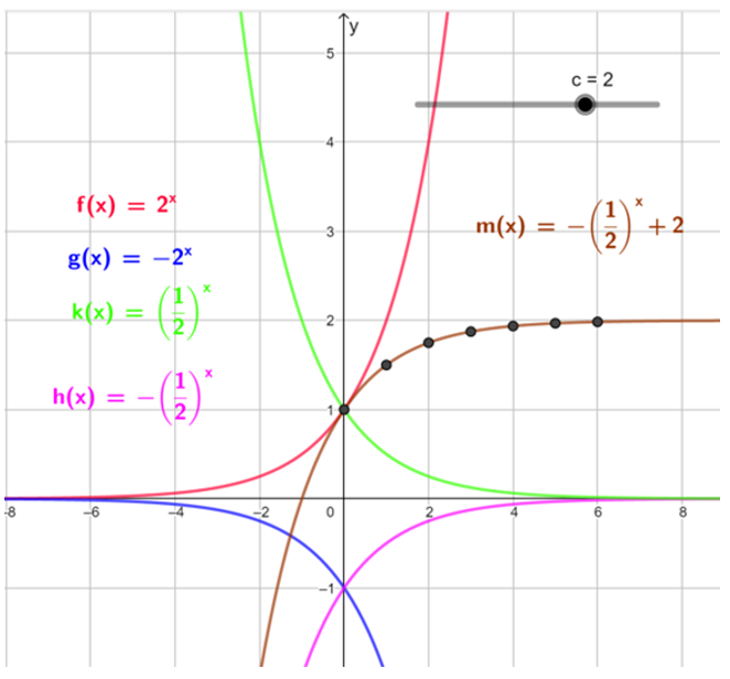 På bildet er det tatt utgangspunkt i f(x) = 2x. Elevene kan observere at grafen har en form som ligner, men at den har feil retning. Bildet viser mulige tilnærminger. Grafen h(x) har riktig form, men ligger for lavt i forhold til punktene. Elevene vet at ved å endre konstantantleddet kan de endre hvor grafen skjærer y-aksen. Hvis de lager en glider, kan de flytte grafen opp og ned langs y-aksen.