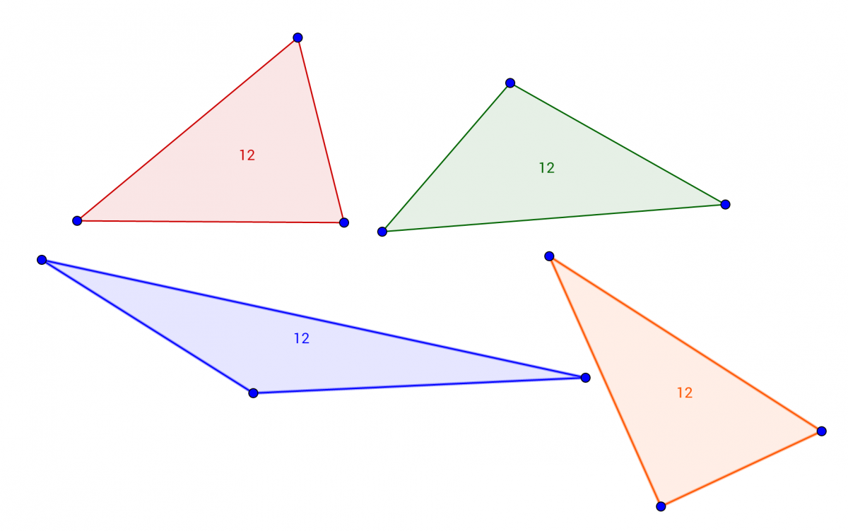Figur 3: Tre trekanter med samme grunnlinje og areal 12.