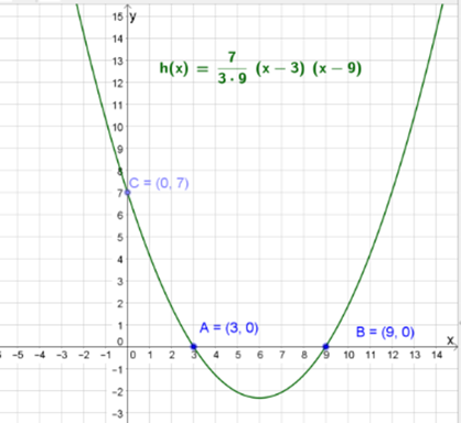 - Punktene A og B skal fortsatt være nullpunkter til en andregradsfunksjon og da må `f(x)=k(x-r)(x-s)`, der r er x-verdien til punkt A og s er x-verdien til punkt B. Verdien til k forteller hvor mye grafen bøyer seg, og elevene skal finne k som gjør at krumningen blir slik at grafen går gjennom punkt C (0, c) på y-aksen. Vi setter x = 0 og f(0) = c. Det gir ligningen: c = k(0-r)(0-s) som forenkles til `k = (c)/(rs)`.