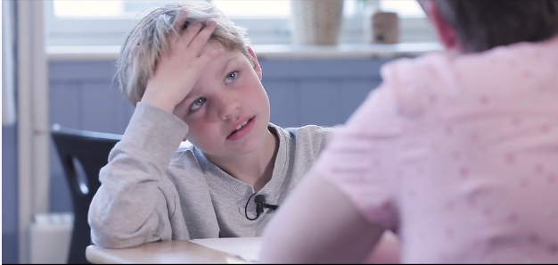 Gutt som ser ut som han grubler mens han ser på lærer.