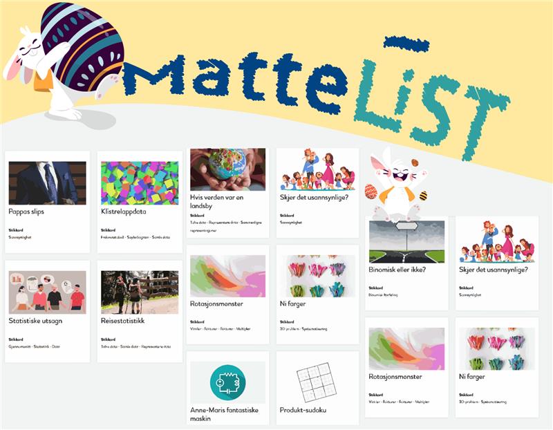 Mattelist.no er et nettsted med matematiske aktiviteter som skal være enkle å komme i gang med, samtidig som de kan gi store utfordringer. Aktivitetene kan brukes av lærere i undervisningen og passer for elever som vil utforske matematikk på egenhånd. Innholdet på MatteLIST.no er hentet fra NRICH ved University of Cambridge, og er oversatt og tilpasset av Matematikksenteret, NTNU.