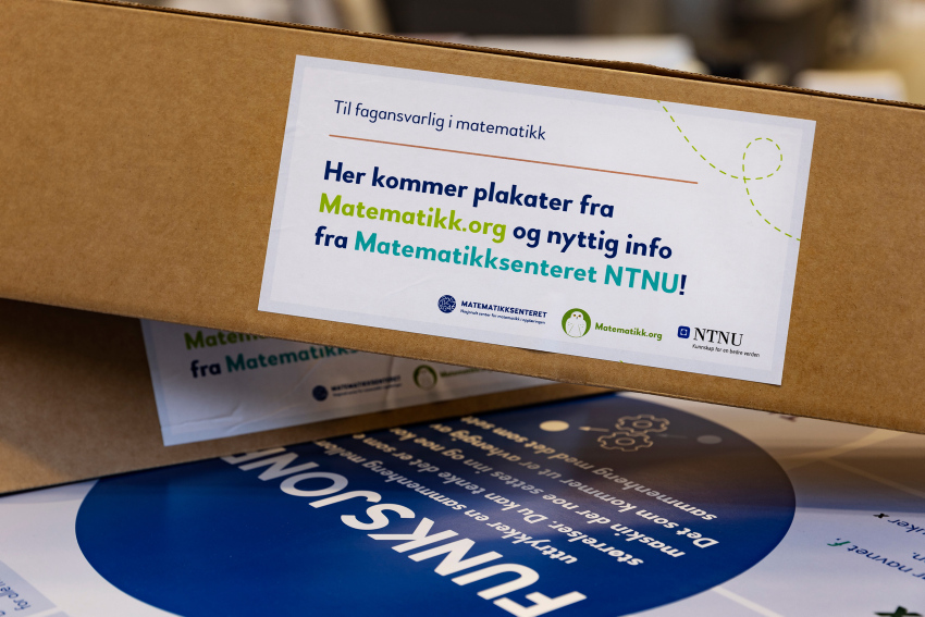 Bilde av etikett på pakke, hvor det står: Til fagansvarlig i matematikk. Her kommer plakater fra matematikk.org og nyttig informasjon fra Matematikksenteret NTNU