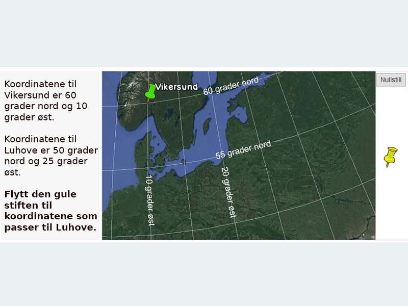 Det er kun 11 prosent av elevene på 5. trinn som løser denne oppgaven riktig. Her må eleven forholde seg både til grader og himmelretning. Selv om koordinatene og plasseringen til Vikersund er oppgitt som en støtte, er det vanskelig å plassere stiften til Luhove riktig. Det at oppgaven er blant de siste i årets prøve, bidrar nok også til å gjøre løsningsprosenten nokså lav.
