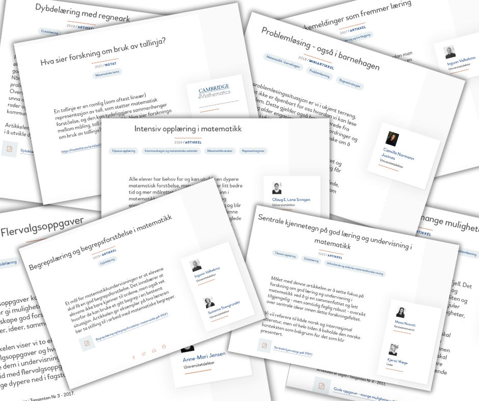 I databasen har vi foreløpig publisert 87 fagartikler om ulike tema innenfor matematikkdidaktikk. Samlingen kommer blant annet fra Matematikksenterets FoU-virksomhet, Realfagsløyper og fagtidsskriftet Tangenten.