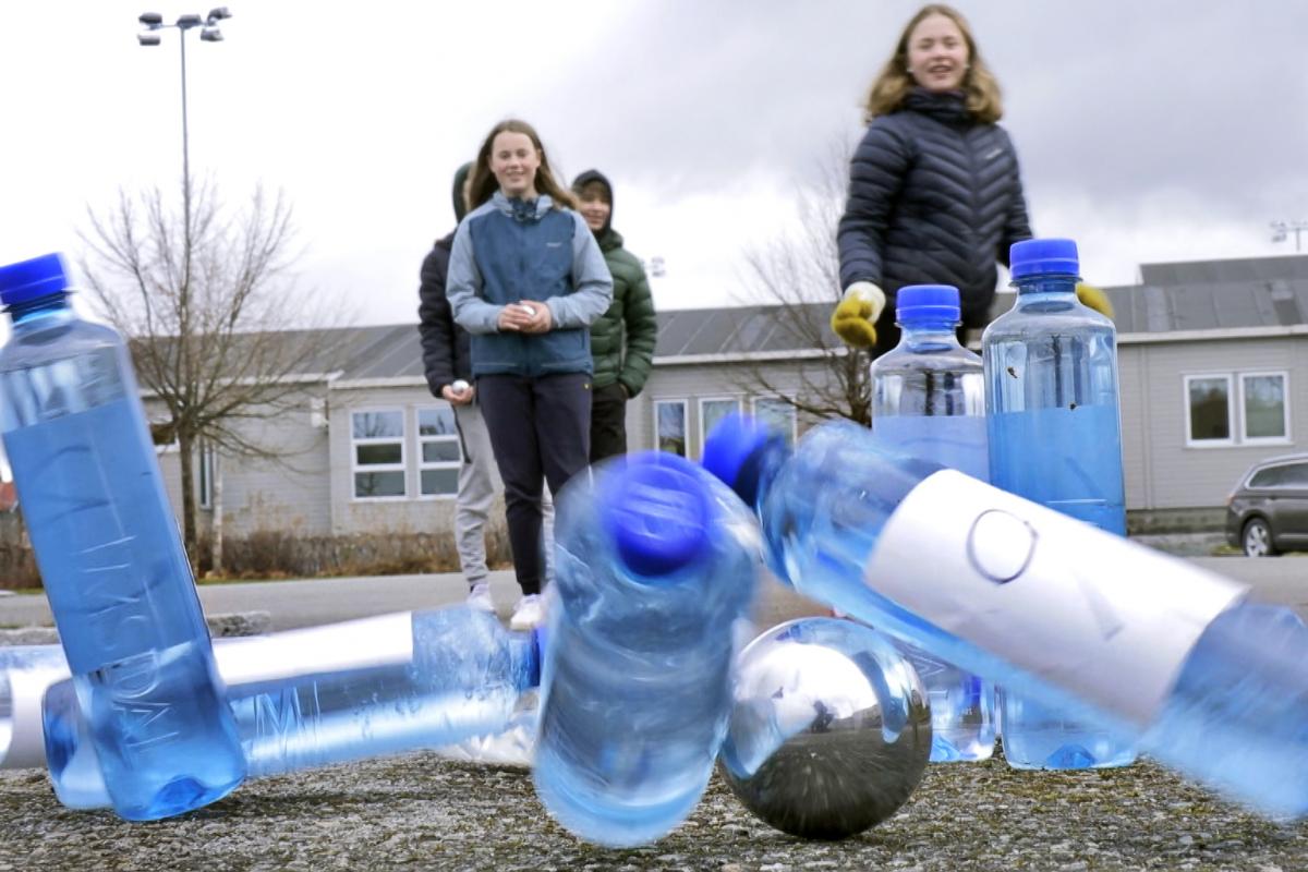 Elevar kaster ei metallkule på plastikkflasker utendørs